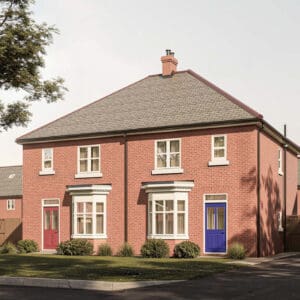 The Elcho — a classic semi-detached home with matching red and green doors, red tiled roof, and soft brick detailing, designed for practical, welcoming living at Gleneagles Drive.