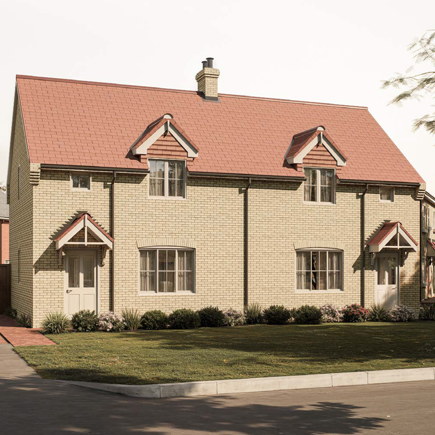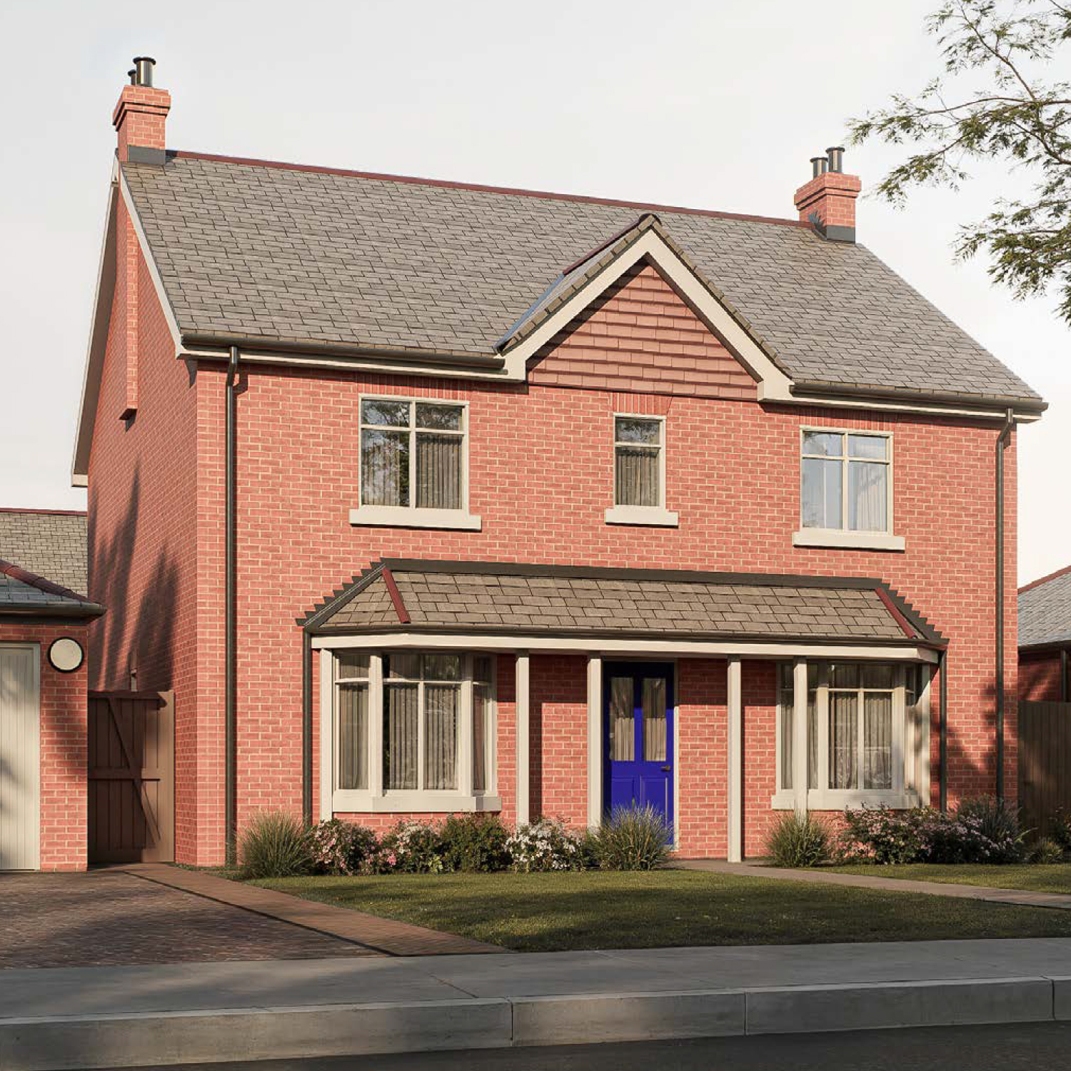 The Errol — a red-brick semi-detached home with dual gables, slate roof, and characterful porches, combining heritage-inspired architecture with modern craftsmanship at Gleneagles Drive.