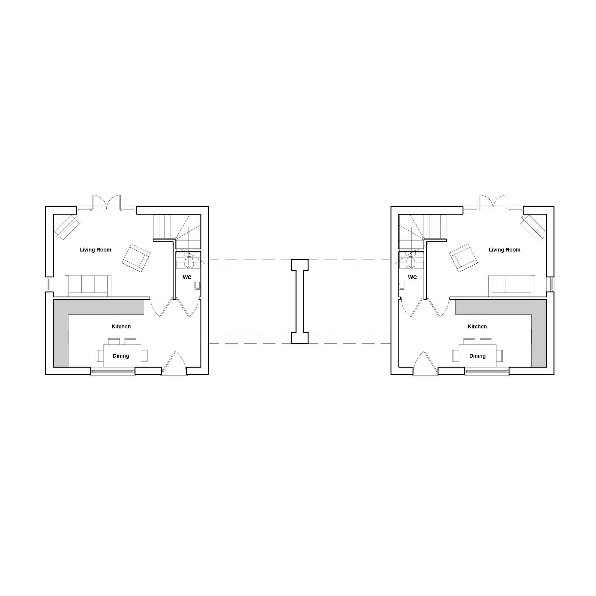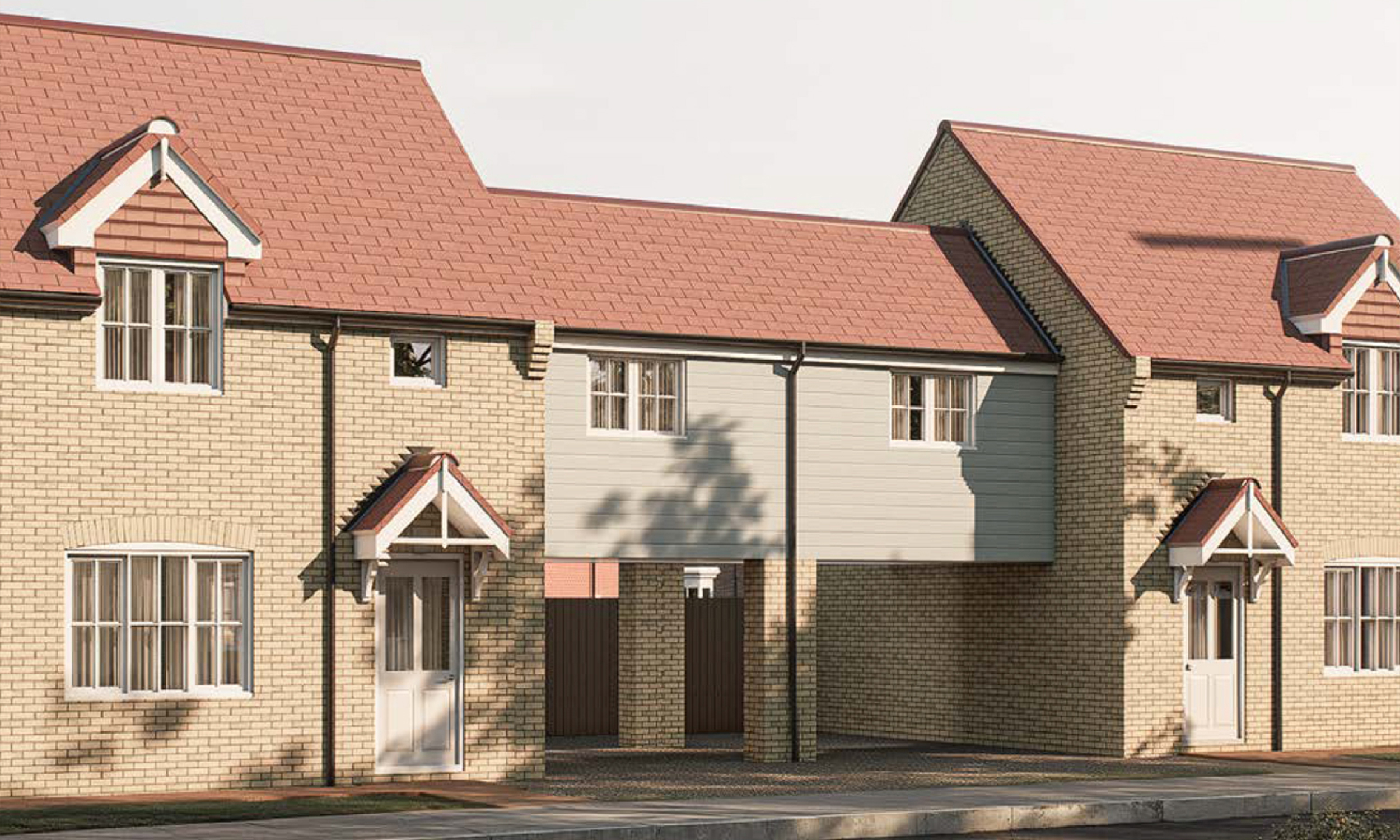 The Elcho — a pair of classic red-brick semi-detached homes with pitched slate roofs and neat front gardens, offering a balance of style, comfort, and practicality at The Furlongs, Holland Park.