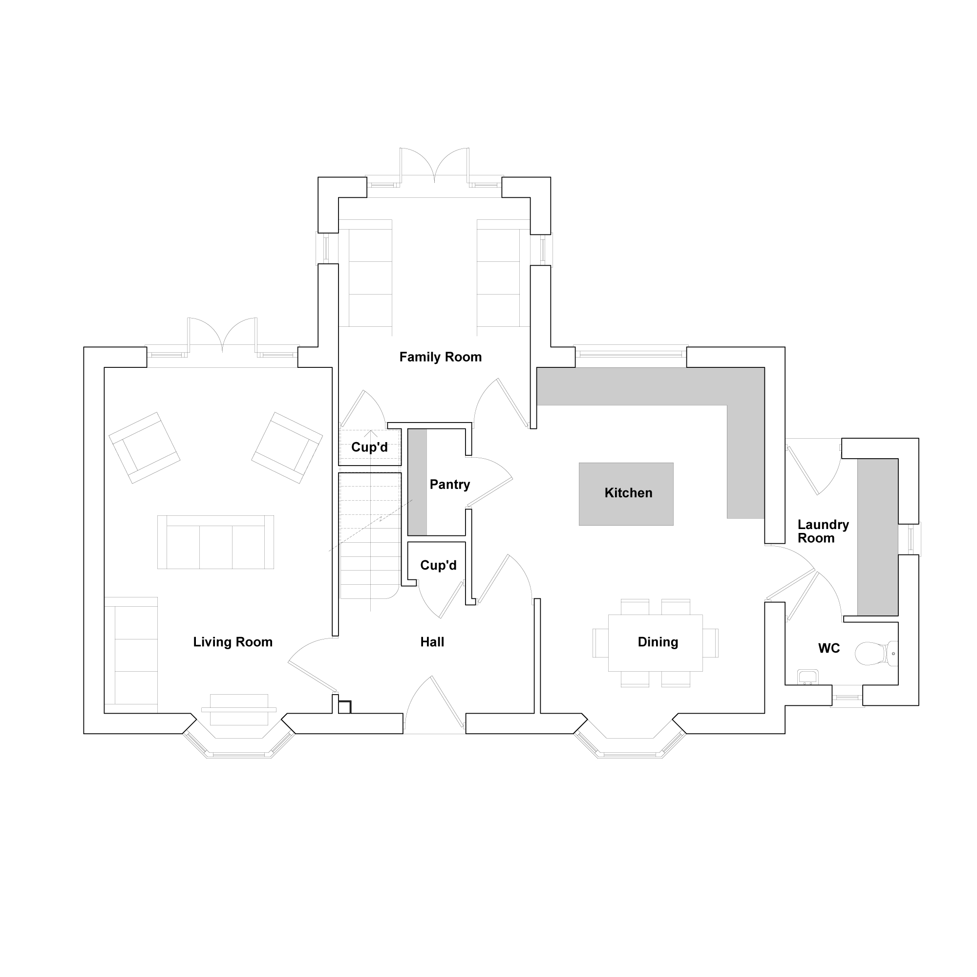 Step through the entrance hallway into a bright living room with a charming bay window - the perfect place to unwind or spend time with family. On the opposite side, the generous kitchen-dining area features a walk-in pantry, with easy access to the laundry room and guest cloakroom for added convenience. A separate family room opens through French doors onto the rear garden, creating a seamless flow between indoor and outdoor living.