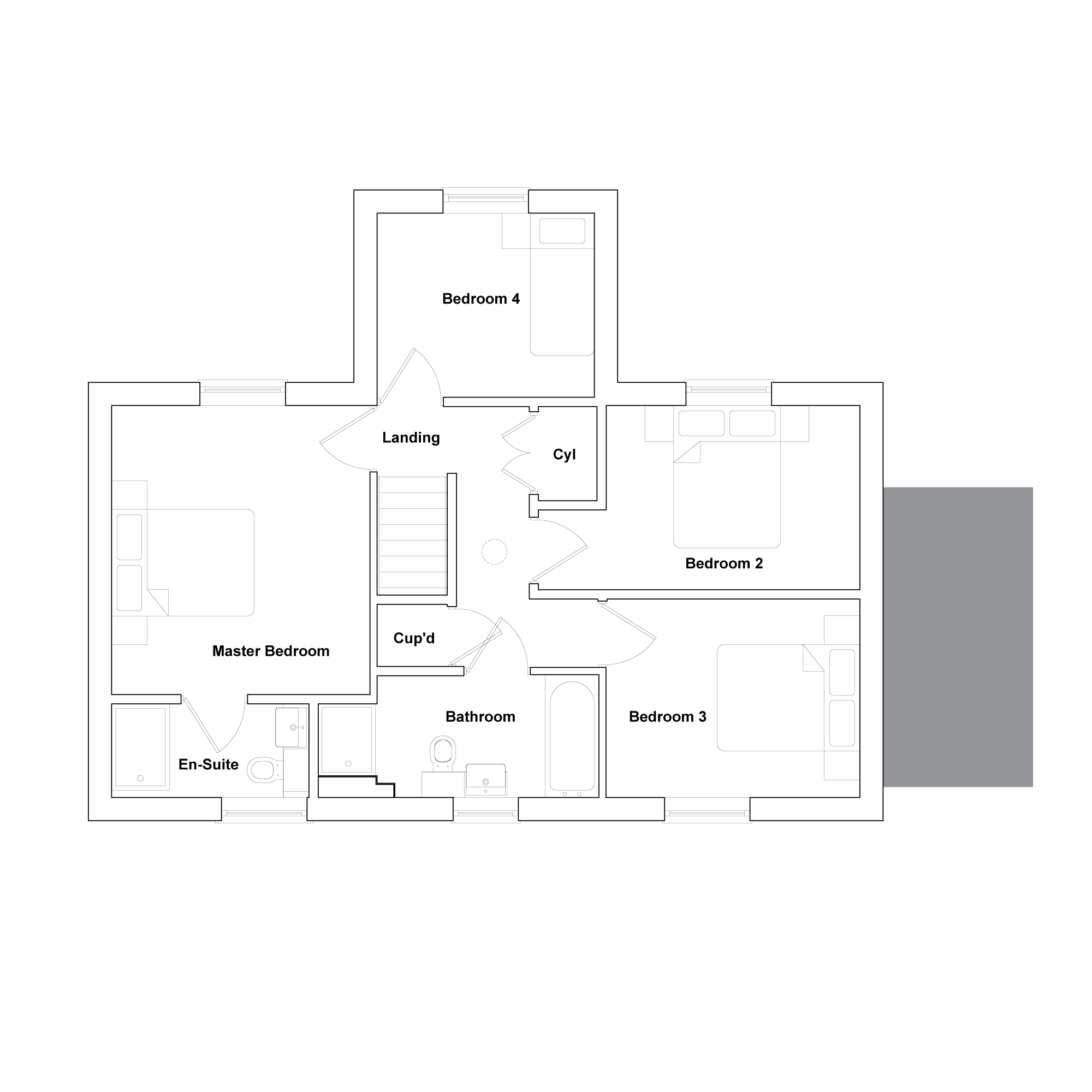 Upstairs, the spacious master bedroom includes a private en-suite, joined by three further bedrooms and a well-appointed family bathroom with both bath and separate shower cubicle. Each space has been designed with comfort and practicality in mind.