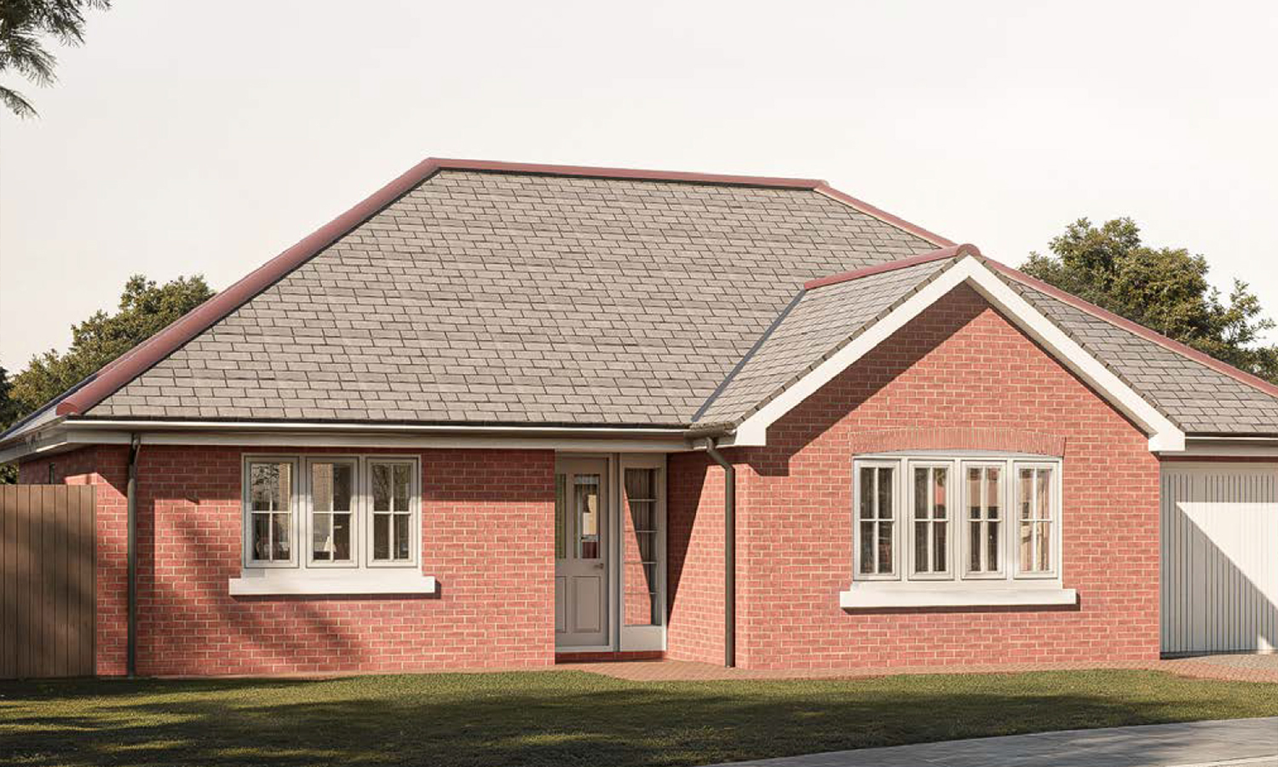 The Strathtay — a spacious red-brick bungalow with a slate-style roof, large windows and attached garage, providing comfortable single-level home living at Gleneagles Drive.